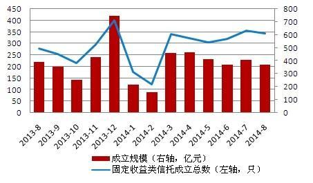 根據格上理財統計,2014年8月,共53家信托公司參與發行,成立346只固定收益類信托產品,納入統計的259只產品總規模為369.7億元。產品數量環比下降2.8%,同比上升23.13%;產品規模環比下降9.25%,同比下降6.26%。8月集合信托成立數量規模較7月略降。