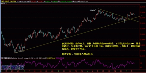 澳元,由於經濟面向好,因此比較堅挺,另外交叉盤也有一定的支援,但由於中國經濟的下行,對澳元中期構成壓力,因此澳元在9500附近可能是一個中期的頂部,到這個位置,若有澳元的倉位,可以考慮出來避一下險。