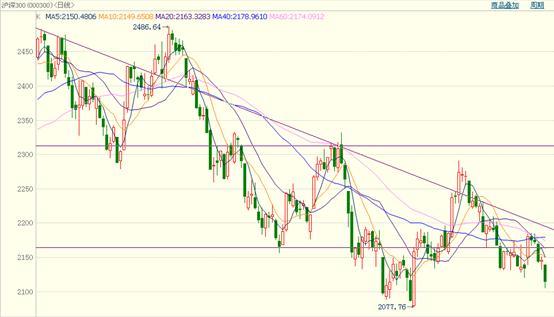 價格形態:股指跌破2170-2310價格區間,市場仍受2013年12月以來的中期下降趨勢線的壓制。從當前形態看,頭肩底技術形態已遭到破壞,市場弱勢仍未得到有效逆轉。當前看,市場處於頸線位2170一線下方,股指再度破位,后市並不樂觀。市場處於二度探底格局,仍宜堅持逢反彈做空的規則。