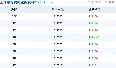 上海銀行間同業拆放利率(Shibor)顯示,短期利率方面,隔夜利率上漲2.00個基點至2.5300%;7天期利率下跌1.40個基點至3.4050;14天期利率下跌1.10個基點至3.9080%;1個月期利率下跌13.45個基點至4.0685%。