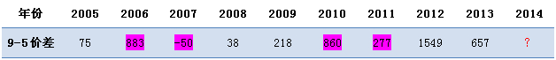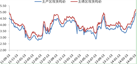 從現貨歷史價差來看,9-5價差均值為500元/500千克,考慮到2014年為周期的大年,我們參照歷史上大年價差來看,2006年、2010年是前兩次牛市的啟動年份,我們可以參照為860元/500千克,那么按照當前4900元/500千克的現貨價格,預計9月的現貨價格在5760元/500千克。從均值來看,預計9月的現貨價格在5400元/500千克。因此未來9月價格預計會在(5400,5760)元/500千克。