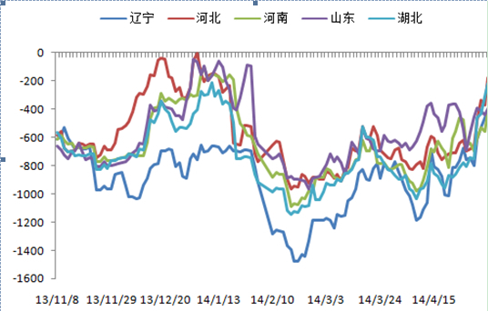 自2月底現貨大幅上漲以來,jd1409基差呈現震盪走強,現貨漲幅明顯強於jd1409合約漲幅。其中3月中下旬基差走弱是現貨上漲過程中的回調導致。截至5月14日收盤,主力jd1409合約基差主要集中在(-494,-194),均值為-300元/500千克。相比2月28收盤,jd1409合約基差主要集中在(-1186,826),均值為-956元/500千克。從基差均值來看,本輪期現貨上漲中,基差走強656元/500千克。從基差絕對水平來看,截至5月14日收盤,主力jd1409合約基差主要集中在(-494,-194),而按照廠庫交割成本為300元/500千克計算,理論上基差保持在-300元/500千克比較合理。那么1409價格相對於河北、山東、湖北交割地現貨價格仍處於貼水狀態。從基差相對水平來看,jd1409合約的從2月底的高度升水到5月初的小幅升水。當前jd1409仍具有做多的價值。
