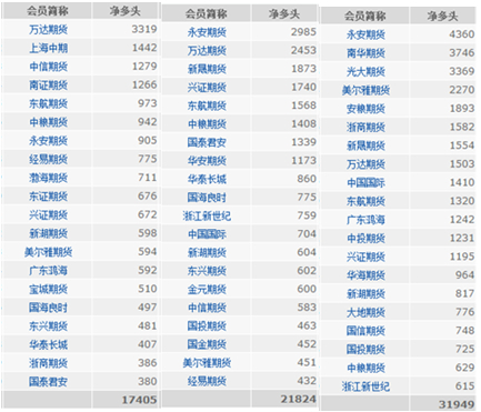 從持倉結構來看,我們選擇10萬手、20萬、30萬持倉來分析持倉結構變化,對應期貨交易時間分別是3月26日、4月23日、5月14日。根據凈多單、凈空單持倉來看,從3月26日增倉上行以來,主力多頭髮生較大的變化,目前永安、南華、光大、美爾雅、安糧占據凈多前五,而在此前僅永安排在凈多單前五。最前面持有凈多單的上海中期、中信期貨、南證期貨均已下榜。而主力空頭變化不大,主要集中在北京中期、長江、徽商、弘業、魯證期貨,期間僅中衍、宏源減持,首創增持。
