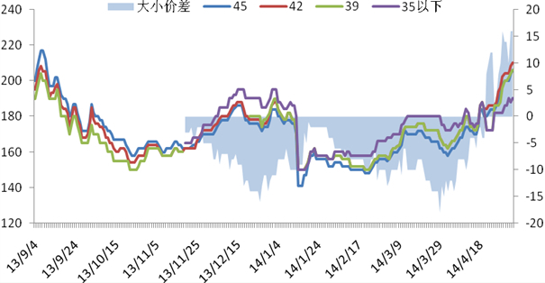 根據我們此前對於湖北地區蛋雛雞銷售情況的跟蹤調查顯示,2013年蛋雛雞銷量呈現“前高后低”的走勢,即上半年銷量比較好,下半年銷量比較差。從大型種雞企業了解到2013年下半年蛋雛雞銷量同比12年同期減幅在30%左右。雞苗價格在2013年下半年跌破生產成本,只有2塊多元/只。從下圖大小碼雞蛋價格來看,進入2013年11月份,小碼雞蛋價格開始高於大碼雞蛋的價格,該狀態一直持續到4月中旬。相比上半年大碼雞蛋高於小碼雞蛋出現的大逆轉。也在側面驗證了補欄呈現“前高后低”的走勢。進入14年由於1、2月份雞蛋行情仍較為低迷,養殖戶延續13年下半年較低的補欄積極性。