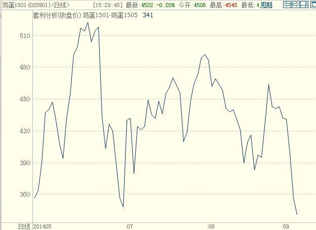 根據歷史統計jd1501與jd1505兩個合約的基本面強弱情況,建議投資者在兩者價差處於300元/500公斤以下時,做多1-5月價差。當二者價差處於500元/500公斤以上時,做空1-5月價差。