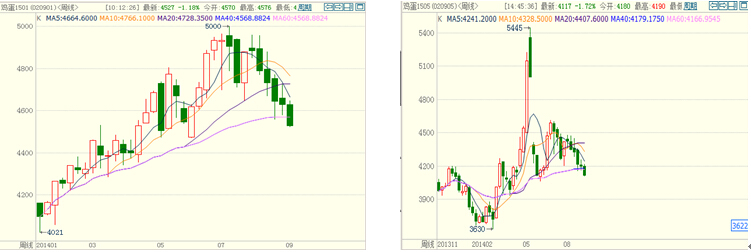 圖1:雞蛋主力合約jd1501周行情走勢 圖2:雞蛋合約jd1505周行情走勢