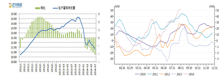 通常情況下,雞蛋補欄發生在春秋季節,我們根據2014年春季蛋雞補欄情況來看,補欄並不理想,在2季度蛋價持續走高的情況下,蛋農並沒有把補欄作為第一首選,而是選擇延遲淘汰蛋雞時間,目前蛋雞存欄仍在下降過程中。預計,在養殖利潤后期維持好轉的前提下,秋季蛋雞的補欄將出現恢復性增長,再結合養殖周期來看,2014年年底雞蛋供應情況或出現好轉,但由於去年禽流感的原因,對於蛋農來說依然心有余悸,后續補欄情況仍需要進一步觀測。