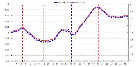 圖5:國內雞蛋均價與季節性指數(年內首周定位基期=1)