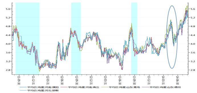 進入2014年后,國內雞蛋價格基本表現為探底回升的走勢,1、2月份市場氛圍偏弱、期價底部徘徊為主,3月份之后,中期上漲模式逐漸開啟、價格重心不斷上移,雖然5月下旬之后陷入調整,但經過短期調整后,雞蛋現貨迎來第二波上漲,雞蛋現貨價格屢創今年新高,強勢特征盡顯。