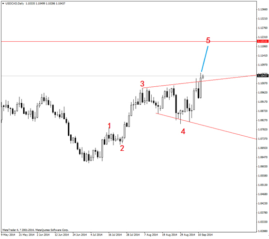 從技術角度分析來看,美元/加元可引起關注。僅天圖根據波浪理論分析來看,行情處於5浪上升之中。目標位置可由前期喇叭形4浪的空間計算得出,即為1.1210附近。因此,可買入美元/加元的看漲期權。