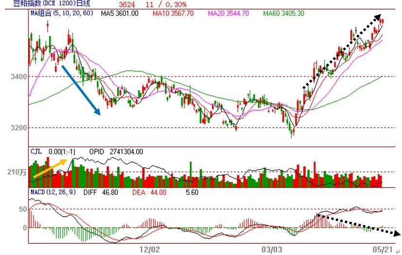 從技術指標macd來看,豆粕期貨的上漲動能也進入日漸衰減的境地,快慢線由上行轉為走平,而且能量柱與價格出現頂背離現象。如果后市快線再度下穿慢線形成死叉,將是較佳的賣出時機。