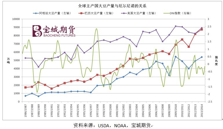 oni指數是美國氣象局為了監測、評估和預報厄爾尼諾/拉尼娜現象而編制的專業指數,計算對象是規定海域的海水表層溫度距平值,單位是℃。厄爾尼諾現象的特征是oni指數為正數,且大於或等於0.5℃,若oni指數連續5次滿足以上條件,可判定厄爾尼諾進入成熟階段。歷史數據顯示,在發生厄爾尼諾的年份,美國、巴西和阿根廷等主產國的大豆產量增長的概率更大。