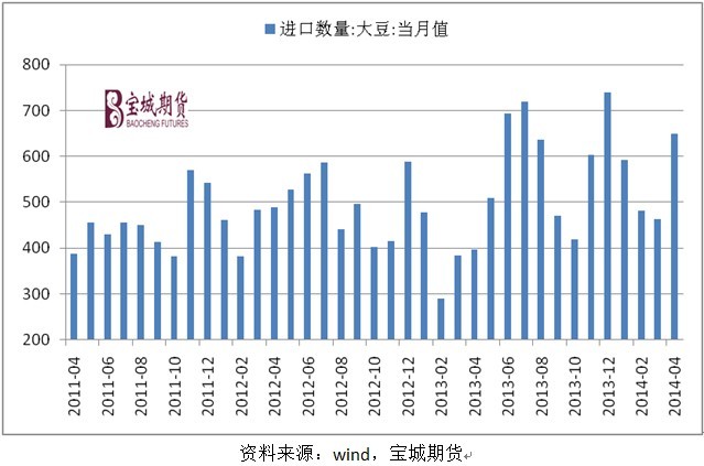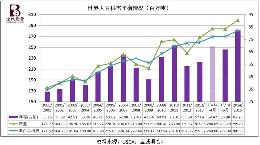 美國農業部在5月份報告中維持南美主產區2013/14年度大豆產量預估不變,小幅下調了世界2013/2014年度大豆期末庫存。對於2014/15年度的大豆供需面,usda預計美國及巴西大豆產量都將創新高,世界大豆產量依然高於總消費量,由此帶動世界大豆庫存提升至8223萬噸的歷史新高。