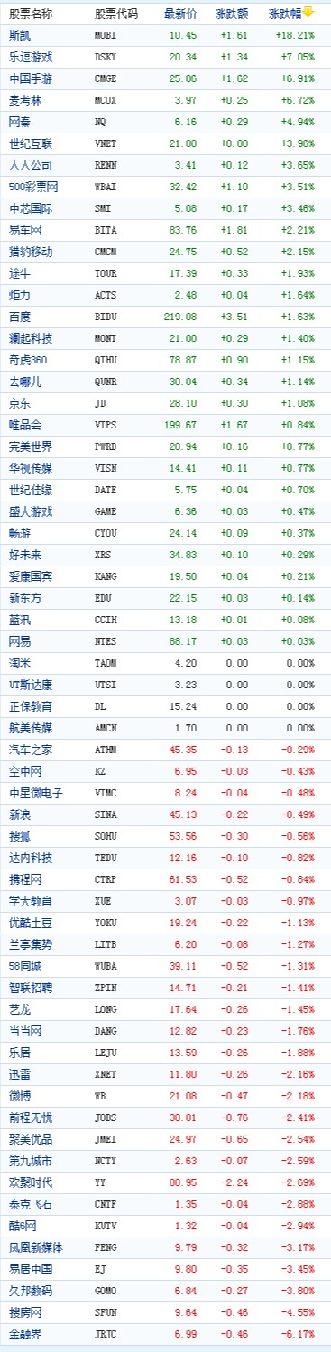 中國概念股周三收盤漲跌互現,4支股票漲幅超過4%,斯凱漲18.21%報10.45美元,樂逗游戲漲7.05%報20.34美元,中國手游漲6.91%報25.06美元,麥考林漲6.72%報3.97美元;5支股票跌幅超過3%,金融界跌6.17%報6.99美元,搜房網跌4.55%報9.64美元,久邦數碼跌3.8%報6.84美元,易居中國跌3.45%報9.8美元,鳳凰新媒體跌3.17%報9.79美元。(峰子)