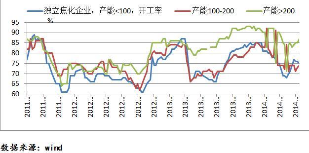 從焦化廠開工率來看產能小於100萬噸的焦化廠開工率比上周減少1%至75%,產能在100-200萬噸的焦化廠開工率小幅升高1%至74%,產能大於200萬噸的焦化企業開工率上升2%至87%,總的來看,上周焦化企業開工率較去年同期有大幅提高,大型焦化企業依舊維持高位開工率。