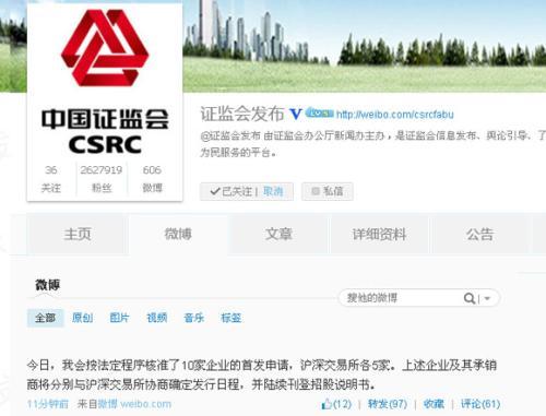 證監會今日晚間發布微博,稱“今日,我會按法定程式核准了10家企業的首發申請,滬深交易所各5家。上述企業及其承銷商將分別與滬深交易所協商確定發行日程。