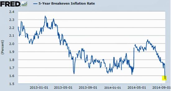 新浪財經訊 北京時間9月25日上午消息,據美國科技財經網站BI,中國“不刺激”及大宗商品價格下跌推動美國通脹預期降至數年新低。下圖為美國30年期國債收益率與同期通脹保值債券收益率之差所暗示的通脹預期。