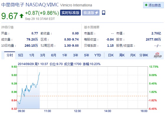新浪科技訊 北京時間9月29日晚間消息,中星微電子早盤大漲,漲幅一度超過10%。截至北京時間22:37分,中星微電子上漲9.86%,報9.67美元。(拉菲)