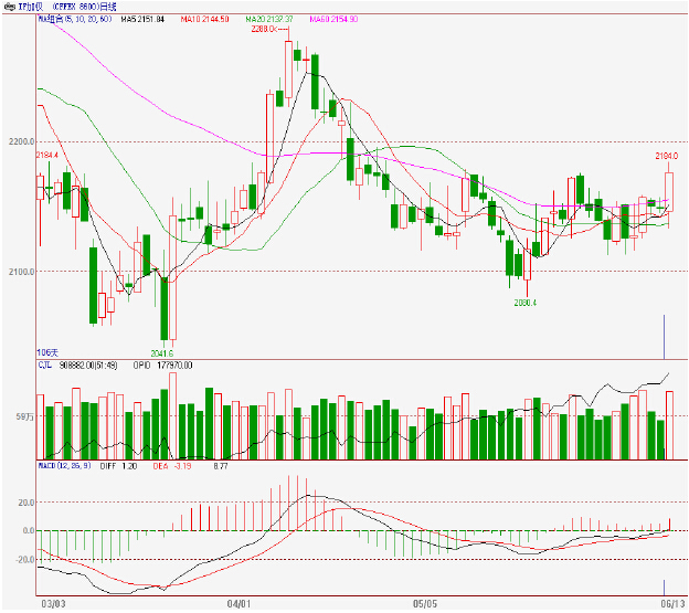 主力合約期指if1406報收於2150.4點,較前一交易日下跌2.6點(-0.12%),成交量減至49.1萬手。滬深300板塊九漲一跌,其中,可選消費(+1.56%)、金融地產(+1.47%)和資訊技術(+1.11%)板塊漲幅居前,僅有公用事業板塊小幅收跌。