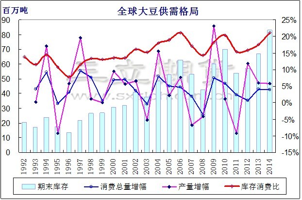 6月usda月度供需報告對大豆數據調整有限,繼續強化美豆舊作供應緊張,而新作豐產預期較強的判斷。對新作產量未做調整,但小幅下調新舊兩季美豆期末庫存。全球大豆期末庫存新舊兩季均不同程度上調,2014/15年度全球大豆期末庫存上調至創紀錄的8288萬噸,較本年度增長35%。而此前市場預計全球大豆期末庫存可能略微下調,給市場帶來利空。全球大豆產量增幅大於消費增長,使得大豆供應寬裕,中長期市場面臨下行壓力。未來市場走勢更多的是由階段性、區域性的供需狀況來決定。