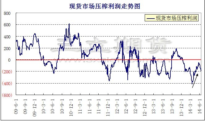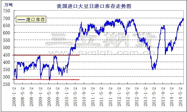 海關總署數據,5月我國大豆進口量為597萬噸,2014年前五個月進口總量2782萬噸,累計數量同比增加高達35%。雖然進口大豆顯著增加,但豆粕、豆油需求並未跟隨大幅增長,導致港口大豆庫存今年以來持續飆升,目前港口庫存高達686萬噸,為歷史最高水平,足夠國內一個月消耗量。國家糧油資訊中心對船期統計,預計6月大豆到港量635萬噸,為上半年第二大到港量。預計短期內市場將面臨進口大豆集中到港的供應壓力。