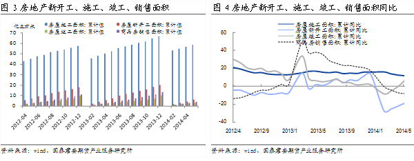 2014年1-5月份,全國房地產開發投資30739億元,同比名義增長14.7%,增速比1-4月份回落1.7個百分點。1-5月份,房地產開發企業房屋施工面積586081萬平方米,同比增長12.0%,增速比1-4月份回落0.8個百分點;房屋新開工面積59912萬平方米,下降18.6%,降幅收窄3.5個百分點;房屋竣工面積30700萬平方米,增長6.8%;商品房銷售面積36070萬平方米,同比下降7.8%,降幅比1-4月份擴大0.9個百分點;5月份,房地產開發景氣指數為95.02,比上月回落0.77點。