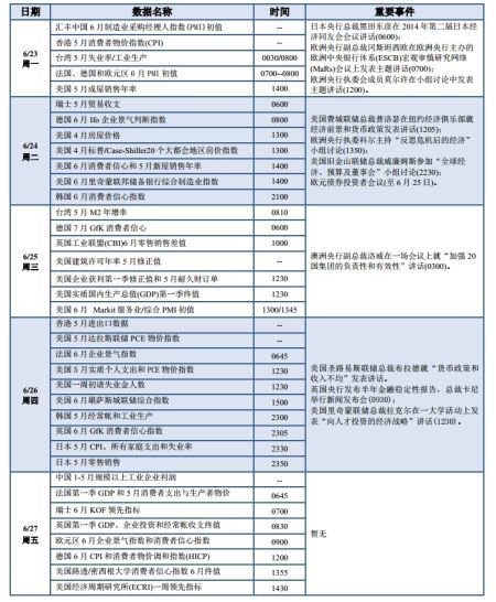 新浪財經訊 北京時間6月22日上午消息,據路透社,下周數位美聯儲官員將就經濟和貨幣政策發表講話,英國央行發布半年金融穩定性報告,行長卡尼還將召開新聞發布會。而匯豐中國製造業PMI初值、美國和英國GDP等重量級數據,都將在下周陸續出爐,敬請關注。