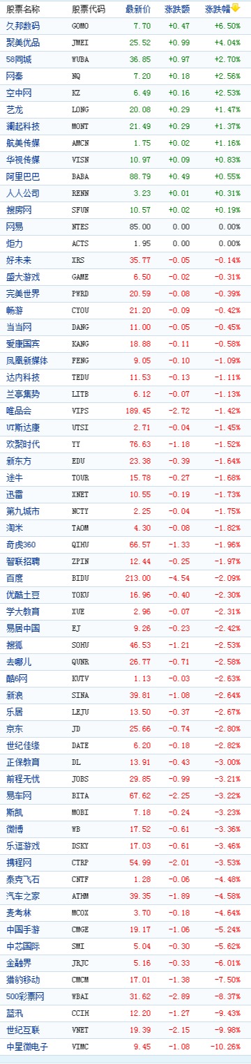 中國概念股周四收盤多數下跌,5支股票跌幅超過7%,中星微電子跌10.26%報9.45美元,世紀互聯跌9.98%報19.39美元,藍汛跌9.43%報12.2美元,500彩票網跌8.37%報31.62美元,獵豹移動跌7.5%報17.01美元;2支股票漲幅超過4%,久邦數碼漲6.5%報7.7美元,聚美優品漲4.04%報25.52美元。(峰子)