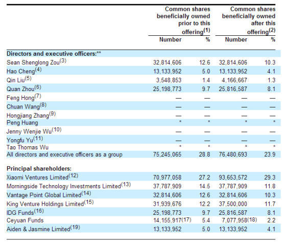該檔案顯示,在迅雷IPO交易完成后,迅雷董事及高管持股情況如下:CEO鄒勝龍持有3281萬股,持股比例10.3%;程浩持有1313萬股,持股比例4.1%;劉芹持有417萬股,持股比例1.3%;周全持有2582萬股,持股比例8.1%。所有董事及高管共持有7648萬股,持股比例23.9%。