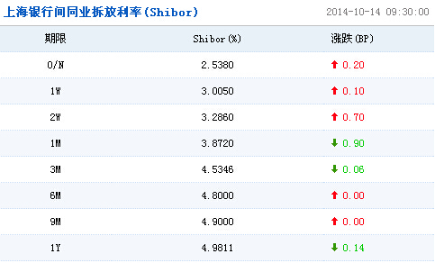 上海銀行間同業拆放利率(Shibor)顯示,隔夜Shibor報2.5380%,上漲0.20個基點;1周Shibor報3.0050%,上漲0.10個基點;2周Shibor報3.2860%,上漲0.70個基點;1個月Shibor報3.8720%,下跌0.90個基點;3個月Shibor報4.5346%,下跌0.06個基點。