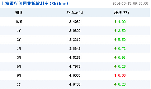 上海銀行間同業拆放利率(Shibor)顯示,隔夜Shibor報2.4980%,下跌4.00個基點;1周Shibor報2.9800%,下跌2.50個基點;2周Shibor報3.2310%,下跌5.50個基點;1個月Shibor報3.8648%,下跌0.72個基點;3個月Shibor報4.5255%,下跌0.91個基點。