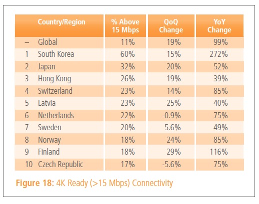 Akamai 還公佈那一個國家已準備好迎接 4K 時代。全球 15Mbps 網速平均覆蓋率只有 11%,韓國占六成為最具資格進入 4K 時代的國家。第二、三名同樣為日本與香港。
