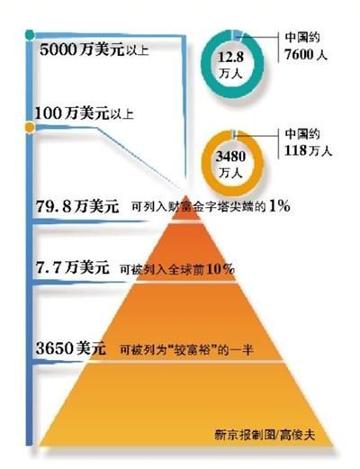 報告顯示,2000年以來,全球範圍內財富達到或超過100萬美元的個人達3480萬人。1%的最富有階層掌握全球48.2%的財富;前10%擁有87%的財富;而“較不富裕”的半數人所擁有資不足1%。