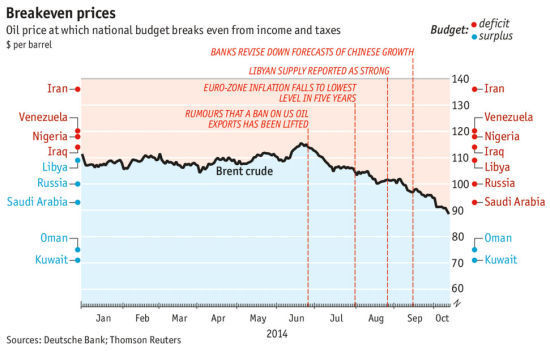 從莫斯科到加拉加斯,從利雅得到巴格達,在德黑蘭、阿爾及爾、科威特城和拉各斯,各國政治領導人、財政部長和央行銀行家都在緊急應對油價暴跌——與6月的峰值相比下跌了大約25%。美國的量增加、對於許多發達國家的需求將持續下跌的預測,以及中國的增長不斷減速的事實都是促使油價暴跌的原因。
