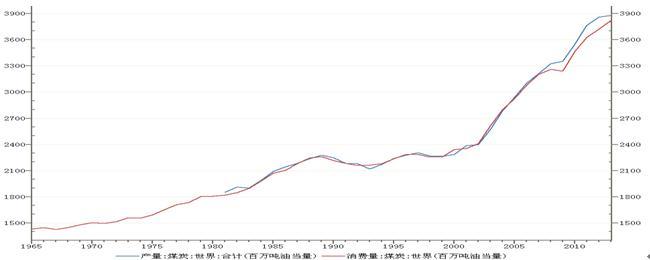 下圖是世界能源委員會關於全球煤炭產消量數據(百萬噸油當量)