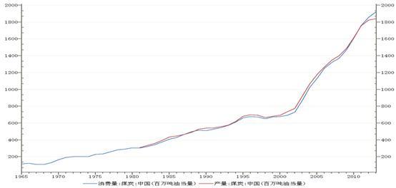 下圖是世界能源委員會關於中國煤炭產消量數據(百萬噸油當量)