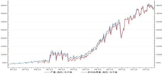 下圖是國內焦炭產量和表觀消費量的數據(萬噸)