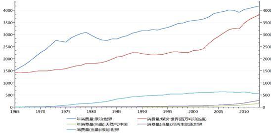 下圖是全球主要能源產品年度消費量的疊加圖: