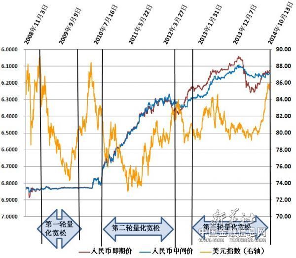 階段二:,2010年6月央行重啟匯率制度改革以來到2011年9月,人民幣匯率出現單邊上漲行情。這段時間,美聯儲處於第二輪QE實施階段,美元指數於2011年4月29日創下了73.03的金融危機以來低點。