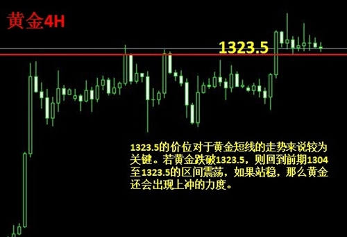 黃金周一的大陽線之后,昨日三度沖擊1330未能突破,整體走勢沖高回落。從日線圖上看,黃金價格運行在布林線中軌上方,布林線開口繼續向上擴張。macd上漲動能柱加強,macd線依然指向上行,代表黃金上漲的力度存在。在四小時圖上,1323.5的價位對於黃金短線的走勢來說較為關鍵。若黃金跌破1323.5,則回到前期1304至1323.5的區間震盪,如果站穩,那么黃金還會出現上沖的力度。