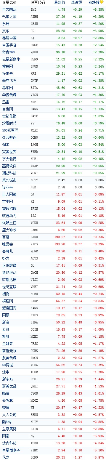 中國概念股周一早盤漲跌互現,藝龍跌5.87%,中星微電子跌5.16%,達內科技跌4.04%,網秦跌3.93%;中芯國際漲6.35%,汽車之家漲3.29%,樂居漲3.2%,京東漲3.09%。(晨暉)