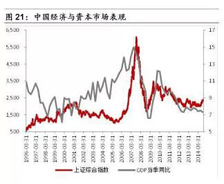 在中國及美國,經濟增長與資本市場表現的聯系有些許不同之處,美國的資本市場表現主要與產出缺口相關,這在90年代后期到次貸危機之前的這段時間體現的很明顯,而中國的資本市場表現主要與經濟增長增速相關性較強,這種差別很好理解,因為產出缺口代表更強的經濟預期的屬性,這對於一個更成熟的股票市場影響相應也會更顯著。