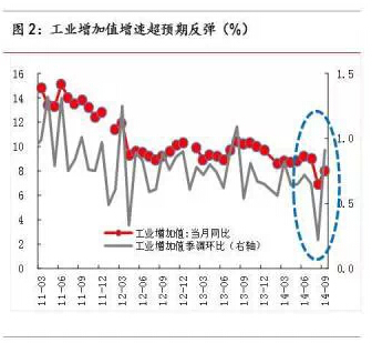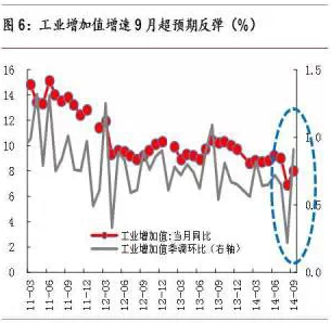 三季度gdp和9月經濟數據顯示,中國經濟在仍然運行在一(兩)個季度上一(兩)個季度下的短周期模式中。這種模式自從九十年以來就相當顯著(圖1)。自12年以來,經濟的下行壓力和政策的向上托力間形成穩態均衡,因此總體經濟波動對政策的加碼或減碼就相當敏感。三季度實現gdp增速年率7.3%,相對第二季度的減速在預料之中,同時此增速略超市場預期的7.2%。 單月來看,工業增加值的增速在經歷了8月6.9%的低谷之后,超預期地反彈至8%(圖2),表明年內經濟最差的時刻已經過去。同時,我們對於各項數據的分細項考察表明,經濟在總量增長偏弱的同時,結構變化正傳遞出積極的信號。這種積極信號主要體現在兩方面,1)短期內經濟增長的模式已從依靠財政刺激向更為市場化的貨幣刺激轉變,2)8月數據所揭示的總供給收縮的狀況已得到明顯改善。展望第四季度,我們預計政策的重心仍將以定向貨幣寬鬆為主,財政刺激跟上,同時大類資產設定方面股債雙牛的局面仍將繼續。
