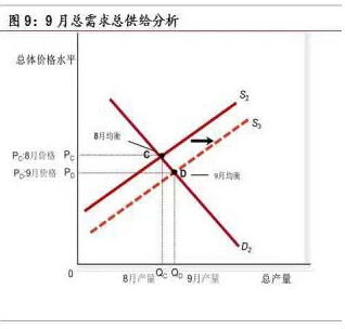 9月需求仍然疲弱,因此總需求曲線並沒有明顯位移,但總供給曲線向右擴張(圖9),均衡點從8月的c點移動至9月的d點。這解釋了為什么9月工業增加值有所反彈而價格同比卻下降的原因。
