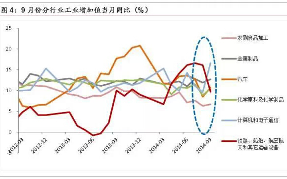 我們是如何發現這樣一個轉變的?這主要得益於對於工業增速的分行業的考察。在8月的數據解讀中,我們注意到工業增加值的分行業增速中(圖3),與財政“鐵公基”緊密相關的行業“鐵路、航空與船舶設備制造業”明顯在4月份開始發力上升,至7月份見頂,然后到8月份急劇下降。隨著財政刺激的減弱,各個行業的預期全面惡化,導致了所有私人產業和周期性產業的下滑。但是9月份的數據中(圖4),與財政“鐵公基”相關的制造業並沒有上升,反而下降很快,但同時許多產業實現了上升。其中黑色金屬、有色金屬有季節因素,因為中國東北、西北地區進入冬季后會停產,所以在進入冬季之前這些產業會在九、十月份加產。但也有許多產業沒有明顯的季節因素,同時去年的基數還比較高,也實現了同比上升,例如農副食品加工業、化學原材料及化學制品業、金屬制品業、汽車制造業,計算機和通訊制造業等。這是一種橫跨各個產業的企穩回升,在財政刺激的減弱的背景下,究其原因,主要來自於貨幣政策的微刺激。