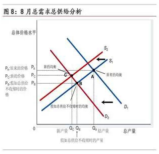 從總需求總供給的框架來分析,8月當總需求曲線向左收縮的同時,總供給的曲線也開始收縮(圖8),均衡點從原來的a點移動至c點。從a點到c點的總產出的下降(qa- qc)大於從a點到b點的總產出的下降(qa- qb);而從a點到c點的價格的下降(pa- pc)小於從a點到b點的價格的下降(pa- pb),這就解釋了為什么8月工業增加值快速下滑而價格數據變化不大的原因。