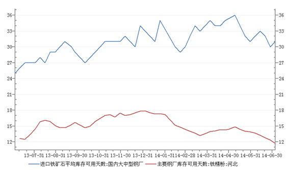 國內鋼廠開工率上升,按鋼協的統計數據顯示,國內重點鋼企6月上旬日均產量達到183.26萬噸,再度更新5月上旬創下的182.41萬噸的歷史記錄,但供給雖然增加,社會鋼材庫存方面卻保持了連續16周下降,雖然其中有鋼貿企業大量缺失導致了缺少蓄水,但需求增速並未萎縮也是重要原因。且未來隨著棚戶區改造以及前期微刺激政策的陸續實施,鋼材需求恢復是大概率事件,若鋼廠因社會需求恢復而使得其資金鏈緊張的情況有安所緩解,未來鋼廠對上游原料的補庫也將有所增加,這無疑提振低迷的鐵礦石價格。而根據wind統計數據,截止7月4日,國內大中型鋼廠進口鐵礦石平均庫存可用天數為31天,從5月初的36天高點回落,也低於去年年底水平,而國內鋼鐵大省-河北省鋼廠鐵礦石可用平均庫存11.72天,創近年新低。