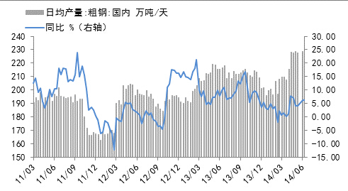 中國鋼鐵工業協會最新公布旬報數據顯示,6月中旬重點企業粗鋼日產量183.67萬噸,旬環比增長0.22%,續創該數據公布以來新高。西本新干線數據顯示,6月中旬國內日均粗鋼產量228.69萬噸/天。