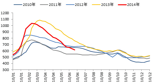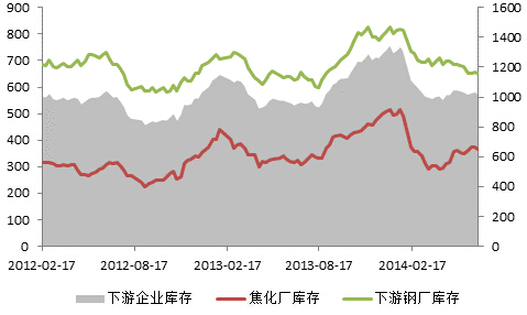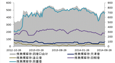 庫存居高不下,據wind數據統計,截止2014年6月27日,煉焦煤庫存四港口合計約722萬噸
