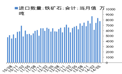 根據海關總署公布的數據:今年前5月我國鐵礦石進口38266萬噸,同比增長6059萬噸或19%。其中,5月進口鐵礦石7738萬噸,同比增加882萬噸或12.9%,環比減少601萬噸。